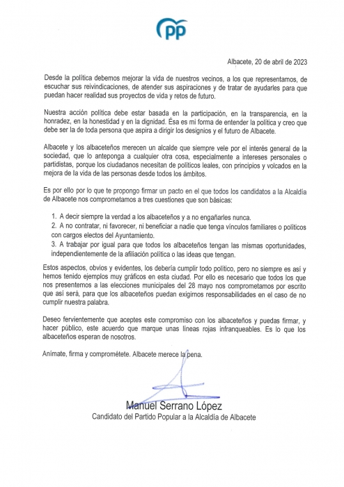 El candidato popular a la alcaldía de Albacete ha firmado ese compromiso esta misma tarde “porque nuestra ciudad necesita políticos leales, con principios y volcados en la mejora de la vida de las personas”.