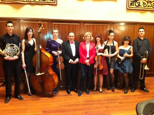 En la foto Carmen Bayod junto a los jóvenes valores y el Director de la Orquesta Sinfónica del Conservatorio Fermín Navarrete García.