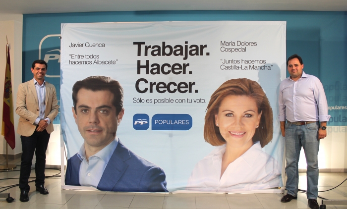 El candidato del Partido Popular a la Alcaldía de Albacete, Javier Cuenca, y el presidente provincial de los ‘populares’ albaceteños y cabeza de lista por Albacete a las Cortes de Castilla-La Mancha, Francisco Núñez, han participado en el simulacro de pegada de carteles en la sede provincial asegurando que “el PP es el único partido político que puede garantizar el futuro de Albacete y de Castilla-La Mancha”.