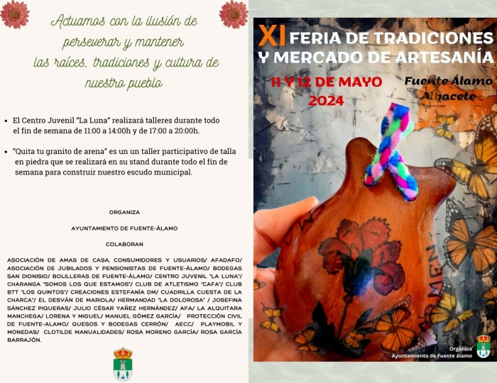 08 de mayo de 2024.- La alcaldesa de Fuente Álamo, Josefa Montes ha informado que de cara a la celebración este próximo fin de semana los días 11 y 12 de mayo de la `XI Feria de las Tradiciones 2024´ desde el equipo de gobierno municipal han actuado con la ilusión de perseverar y mantener las raíces, tradiciones y cultura del municipio y para ello se ha preparado un gran programa de fiestas pensado para el agrado todos los gustos de los vecinos y para topas las edades”.