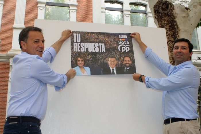 Con la tradicional pegada de carteles, el Partido Popular de Albacete ha dado el pistoletazo de salida a la campaña electoral de las elecciones europeas del próximo día 9 de junio, en “las que nos jugamos el futuro, pues son unas elecciones trascendentales”, tal y como ha destacado el presidente provincial de los ‘populares’, Manuel Serrano, junto al candidato albacetense que forma parte de la lista al parlamento europeo que encabeza Dolors Monserrat, Santiago Sánchez, y resto de cargos públicos del Partido Popular.