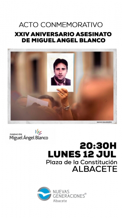 10. julio. 2021. El presidente provincial de Nuevas Generaciones de Albacete, Juan Carlos González, ha informado del acto homenaje a Miguel Ángel Blanco que tendrá lugar el próximo lunes, día 12, a las 20:30 horas, en la albaceteña Plaza de la Constitución, con motivo del XXIV aniversario de su brutal asesinato a manos de la banda terrorista ETA.